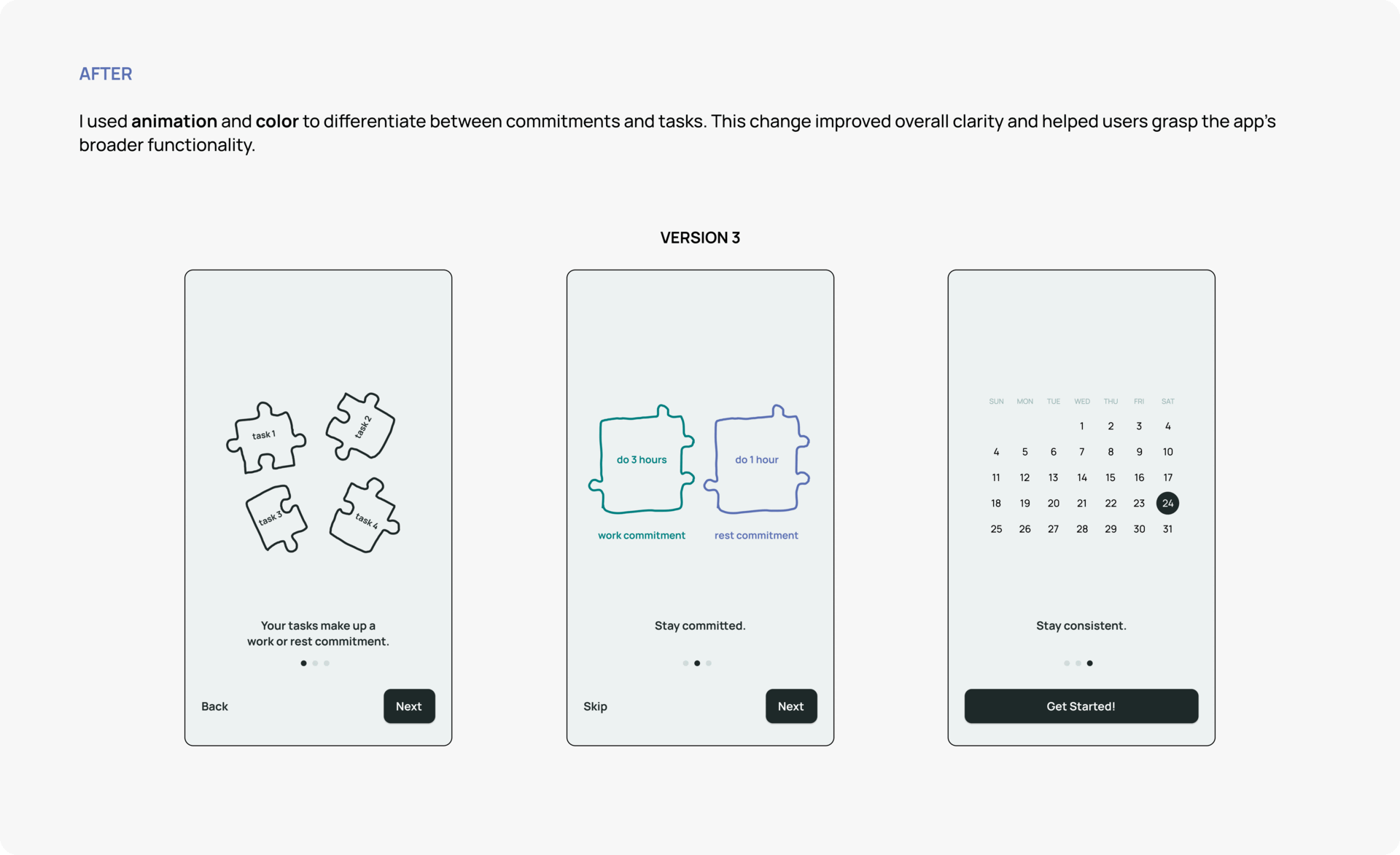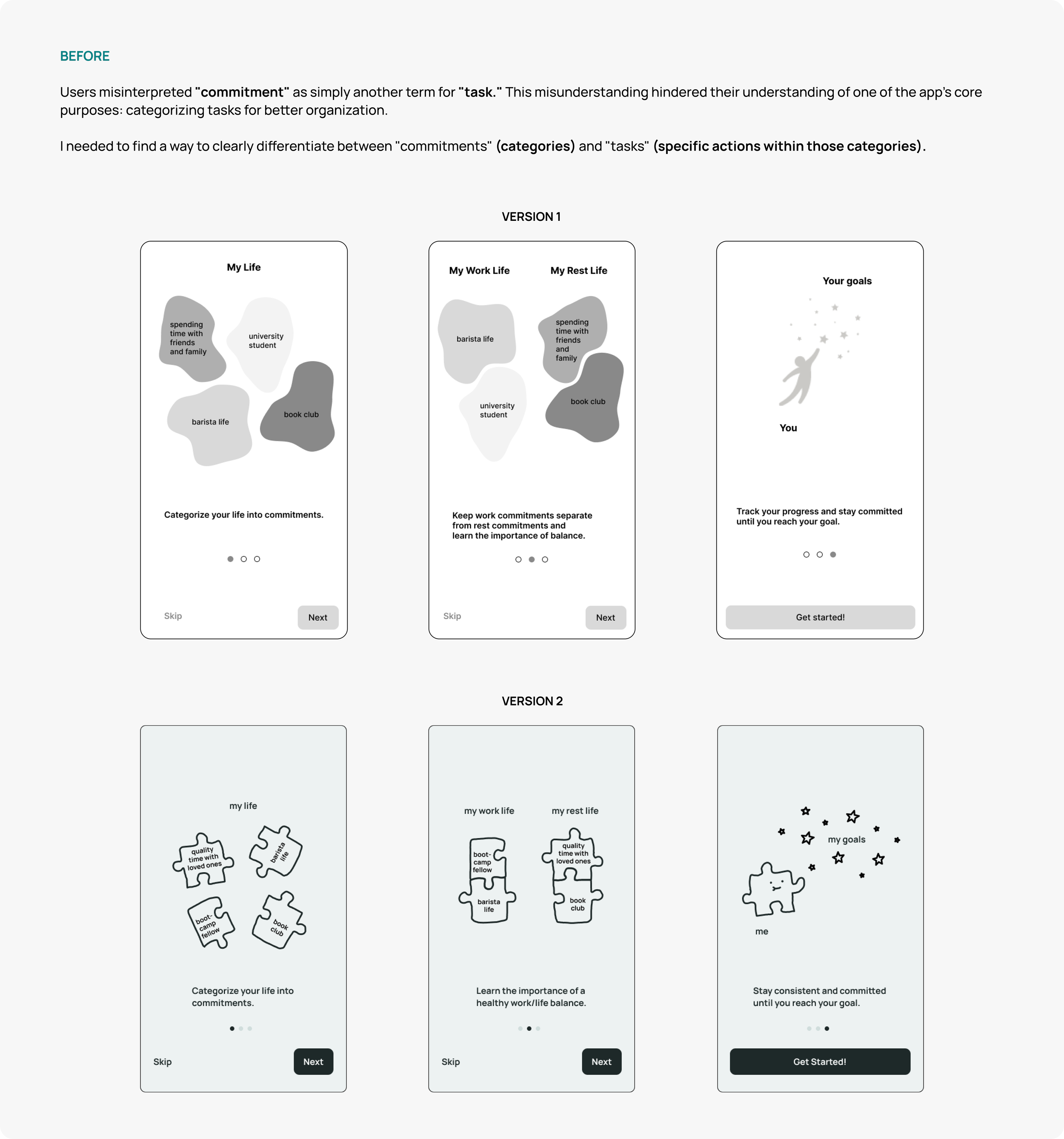 Through usability tests, I learned that the onboarding process is crucial for helping users understand the unique concept of this mobile app.
