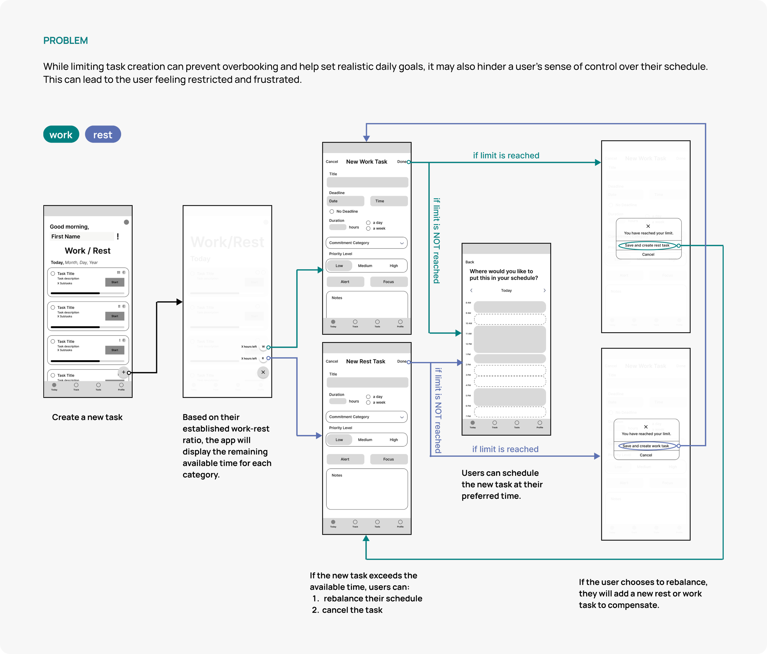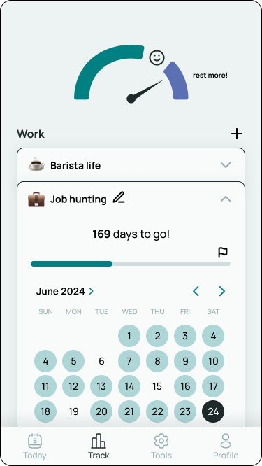 After guiding the user to establish their ideal Work-Rest ratio, the app would determine a fixed number of hours for each category to be achieved daily, preventing burnout while ensuring goal attainment.